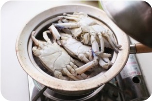 - 찜기에 물을 넣고 끓입니다. 찜기 바닥에 물이 닿지 않도록 주의합니다. 물이 끓기 시작하면 찜기 위에 꽃게를 고르게 놓습니다. 꽃게가 겹치지 않게 놓으면 고르게 찔 수 있습니다.