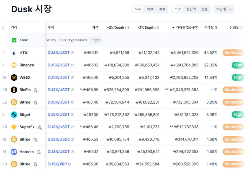 더스크 코인은 현재 바이낸스, 후오비 글로벌, KuCoin 등 글로벌 거래소에 상장되어 있습니다. 이러한 상장은 프로젝트의 안정성을 반증하는 것으로, 더스크 네트워크의 신뢰성을 높입니다.