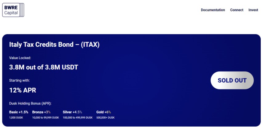 지난 6월 10일, APR 12%에 달하는 Italy Tax Credits Bond를 판매하여 큰 인기를 끌었습니다. 이 채권은 판매 즉시 매진되었고, DUSK 토큰을 일정 물량 이상 보유 시 수익률을 증가시킬 수 있는 장점이 있습니다. 이러한 안정적인 투자 기회를 제공하면서 많은 투자자들의 관심을 받았습니다.