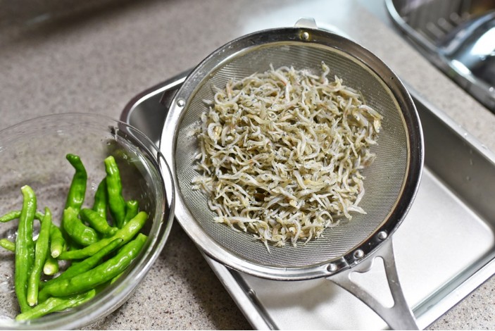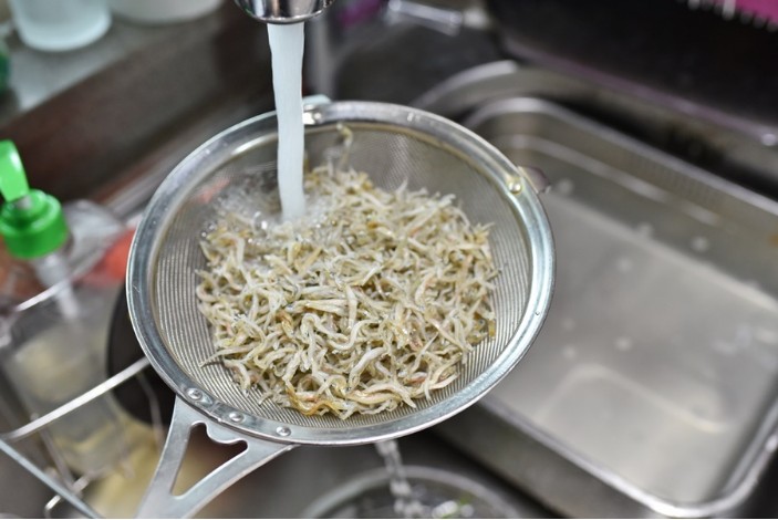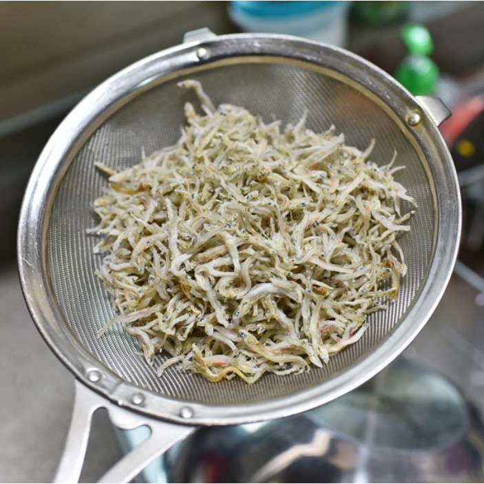 멸치의 비린 맛을 줄이고 부드럽게 만들기 위해, 멸치를 먼저 찬물에 헹궈줍니다. 멸치가 짜다면 찬물에 살짝 담가서 헹궈준 후 물기를 제거합니다.