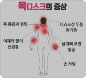 경추 추간판 탈출증이라고도 불리는 목디스크는 경추 내부의 디스크가 손상되거나 돌출되어 신경을 압박하는 질환이다. 이는 주로 노화, 잘못된 자세, 부상 등으로 인해 발생하며, 최근에는 스마트폰 및 컴퓨터 사용 증가로 젊은 층에서도 빈번히 발생하고 있다. 신경 압박으로 인해 팔 저림, 어깨 통증, 두통, 손의 힘 약화 등의 증상이 나타날 수 있다.