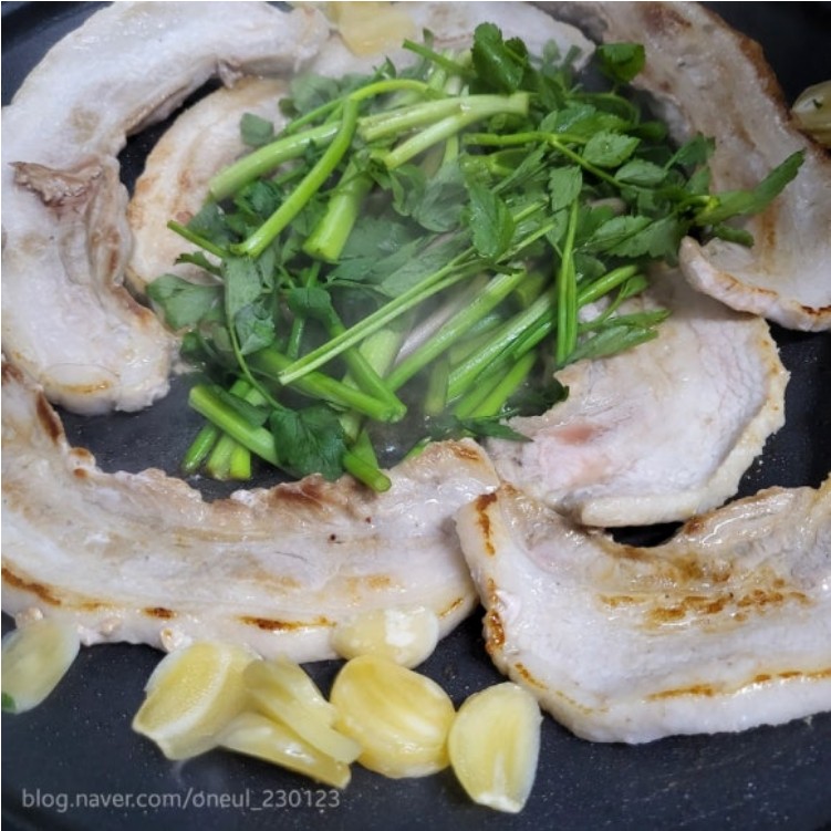 - 삼겹살 기름에 미나리와 마늘을 넣고 함께 볶아줍니다.