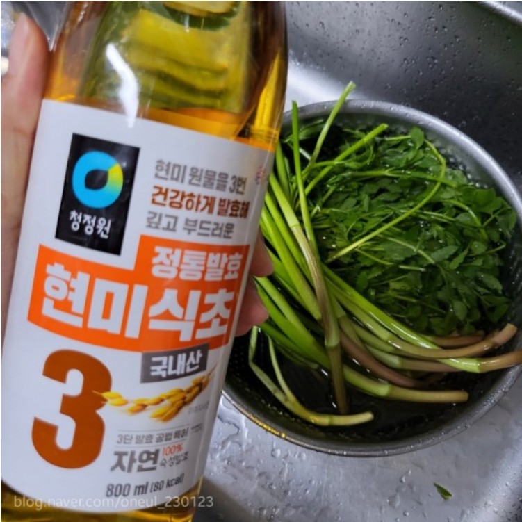 - 세척: 미나리를 물로 깨끗이 씻은 후 식초를 푼 물에 잠시 담갔다가 흐르는 물로 헹구어줍니다.