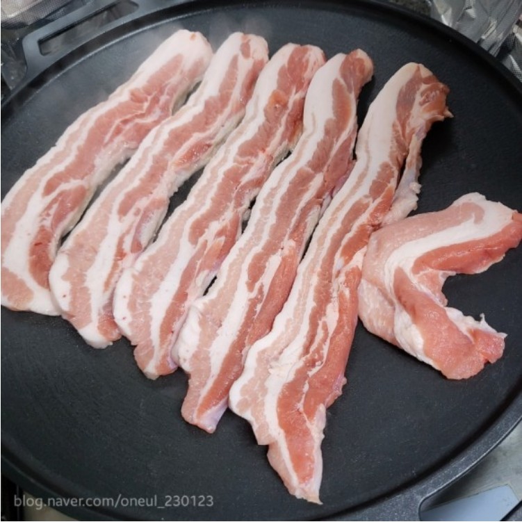 - 삼겹살을 팬에 넣고 중불에서 익혀줍니다.