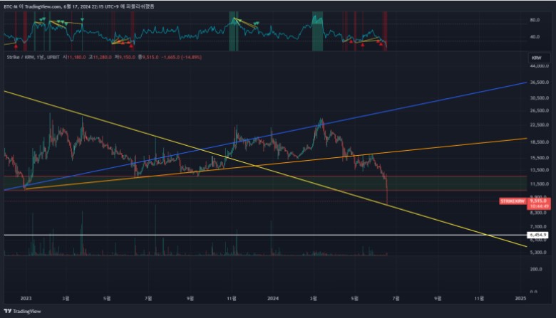 스트라이크(STRK) 코인은 최근 업비트 차트에서 주목할 만한 움직임을 보였습니다. 빨간색 지지 매물대 구역을 기점으로 주황색 상승 추세를 형성했지만, 추세가 하락하며 리테스트까지 마치고 강하게 지지 매물대 구역을 돌파했습니다. 현재 위치는 지지를 받을 수 있는 구간으로, 약간의 반등이 예상되지만, 반등 없이 강한 하락 흐름이 계속된다면 하얀색의 마지막 구간을 지켜야 향후 긍정적인 흐름을 기대할 수 있습니다.