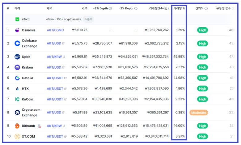 아카시 네트워크는 약 33개의 거래소에서 거래가 가능합니다. 그중 인기 거래소이거나 거래량이 많은 거래소는 업비트와 게이트 아이오(Gate.io)입니다. 특히 업비트에서 거래량이 가장 많이 발생하고 있어, 해당 거래소를 이용하는 것을 추천드립니다. 또한, 레버리지를 활용하고 싶으신 분들은 바이비트(Bybit)와 비트겟(Bitget)과 같은 해외 거래소를 추천드립니다.