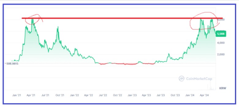 아카시 네트워크(Akash Network)는 22년 5월부터 후오비(Huobi)에서 활발히 거래되고 있습니다. 현재 아카시 네트워크는 저점에서 고점까지 약 4500% 상승을 보였으며, 초록색 상승 채널 안에서 움직이고 있습니다. 그러나 최근 빨간색 저항 매물대 구역을 돌파하지 못하고 잠시 주춤거리는 모습을 보이고 있습니다. 해당 구간은 21년 4월경 만들어진 저항 구역으로, 강하게 뚫어주는 모습을 보여주어야 긍정적으로 판단되지만, 신규 진입하여 수익을 얻고자 하기에는 큰 리스크가 있다고 판단됩니다.