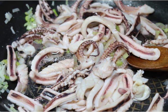 - 오징어와 삼겹살 볶기: 삼겹살이 반쯤 익으면 오징어와 양파, 대파를 넣고 볶아줍니다.
