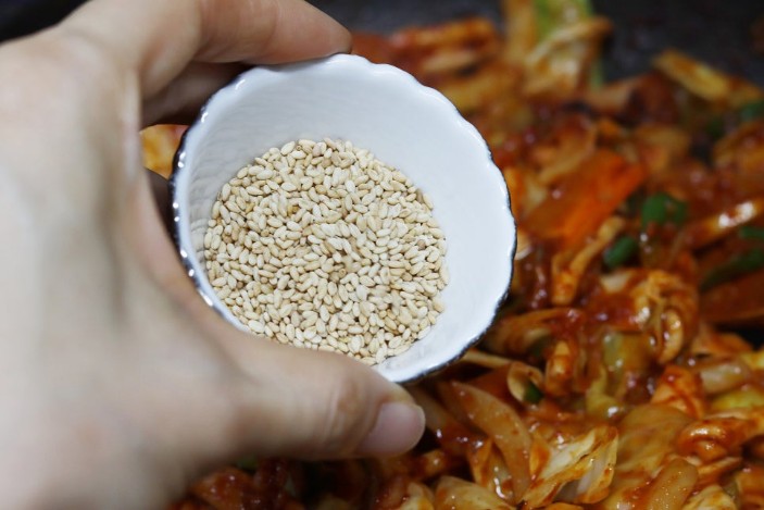 - 참기름과 통깨: 마지막으로 참기름 1 큰술과 통깨를 넉넉하게 뿌려줍니다.