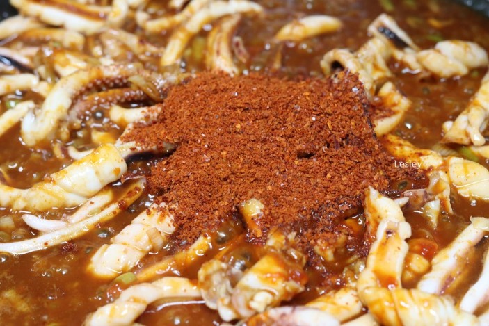 - 고춧가루 추가: 고춧가루 3 큰술을 넣고 볶아줍니다. 양념이 뻑뻑해지면 물 0.3컵을 추가합니다.