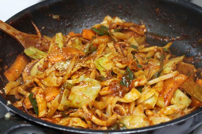 - 주재료 볶기: 손질한 오징어와 야채를 모두 넣고 센 불에서 볶습니다.
