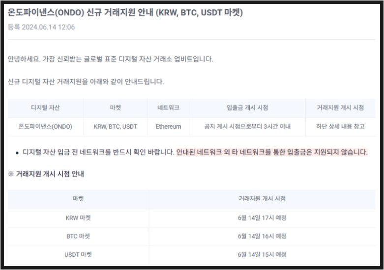지난 6월 20일, 온도 파이낸스(ONDO) 코인이 업비트에 신규 상장되었습니다. 온도 파이낸스는 원화, BTC, USDT 마켓에 동시 상장되었으며, 원화 마켓에서는 17시에 거래가 시작되었습니다. 이번 상장은 기존에 없던 방식으로, 1시간 간격으로 상장이 이루어졌습니다.