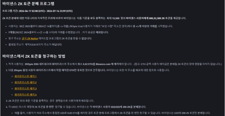 바이낸스 거래소에서는 2023년 2월부터 2024년 3월까지 ZKSync 네트워크를 사용한 이력이 있는 회원을 대상으로 에어드랍 프로그램을 진행합니다. 총 50건 이상의 거래를 완료한 회원에게만 해당되며, 스스로 거래한 내역은 제외됩니다.