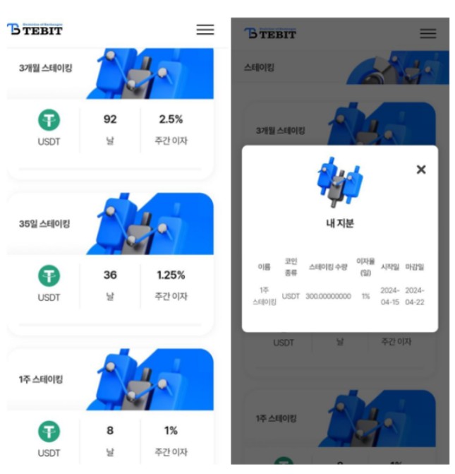 테빗 거래소에서는 테더(USDT)를 예치하는 스테이킹 상품을 제공합니다. 스테이킹 기간은 1주, 35일, 3개월 등이 있으며, 기간이 만료되면 원금과 이자가 자동으로 투자자의 지갑으로 입금됩니다. 테빗 거래소의 스테이킹 서비스는 최대 월 이율 10%의 수익률을 보장합니다.